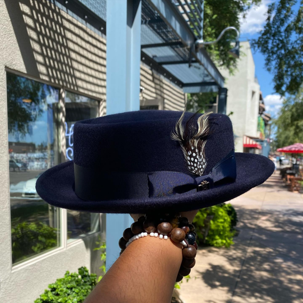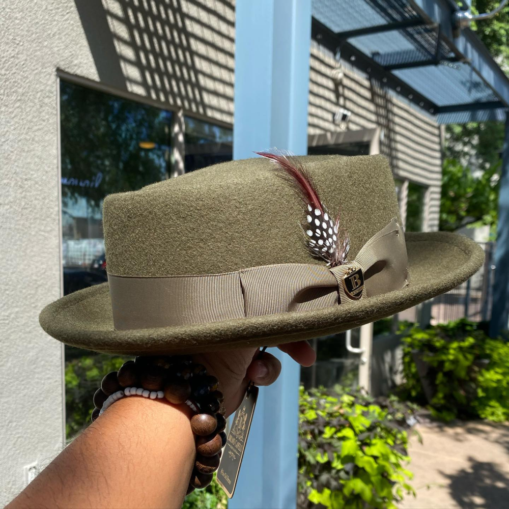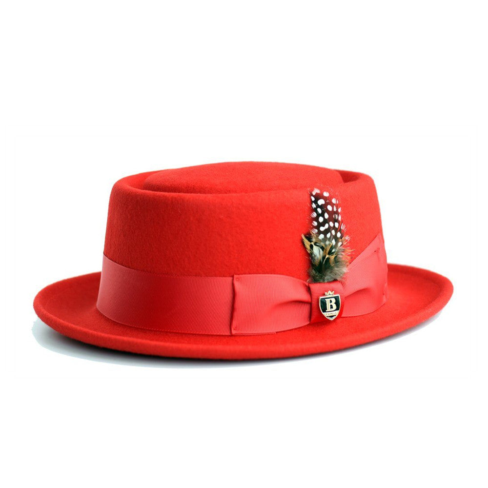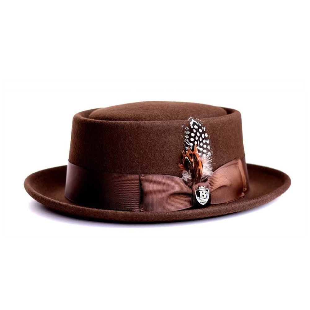 The wool pork pie is made of 100% wool felt, providing a smooth and supple feel. This hat is finished with a grosgrain hat band and decorative feather accent.